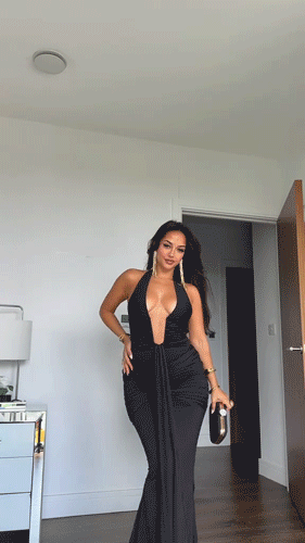 The dress features a plunging halter neckline with U-wire support, combining a provocative element with an elegant structure that beautifully showcases the figure.