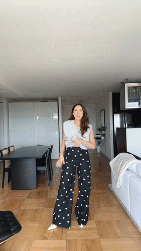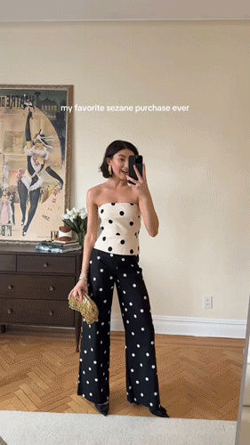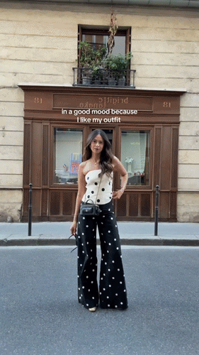 Both the blouse and trousers feature a classic polka dot pattern, a timeless design that injects a retro yet playful sense of style into the overall look. The contrasting black and white polka dots create a simple yet striking visual impact.